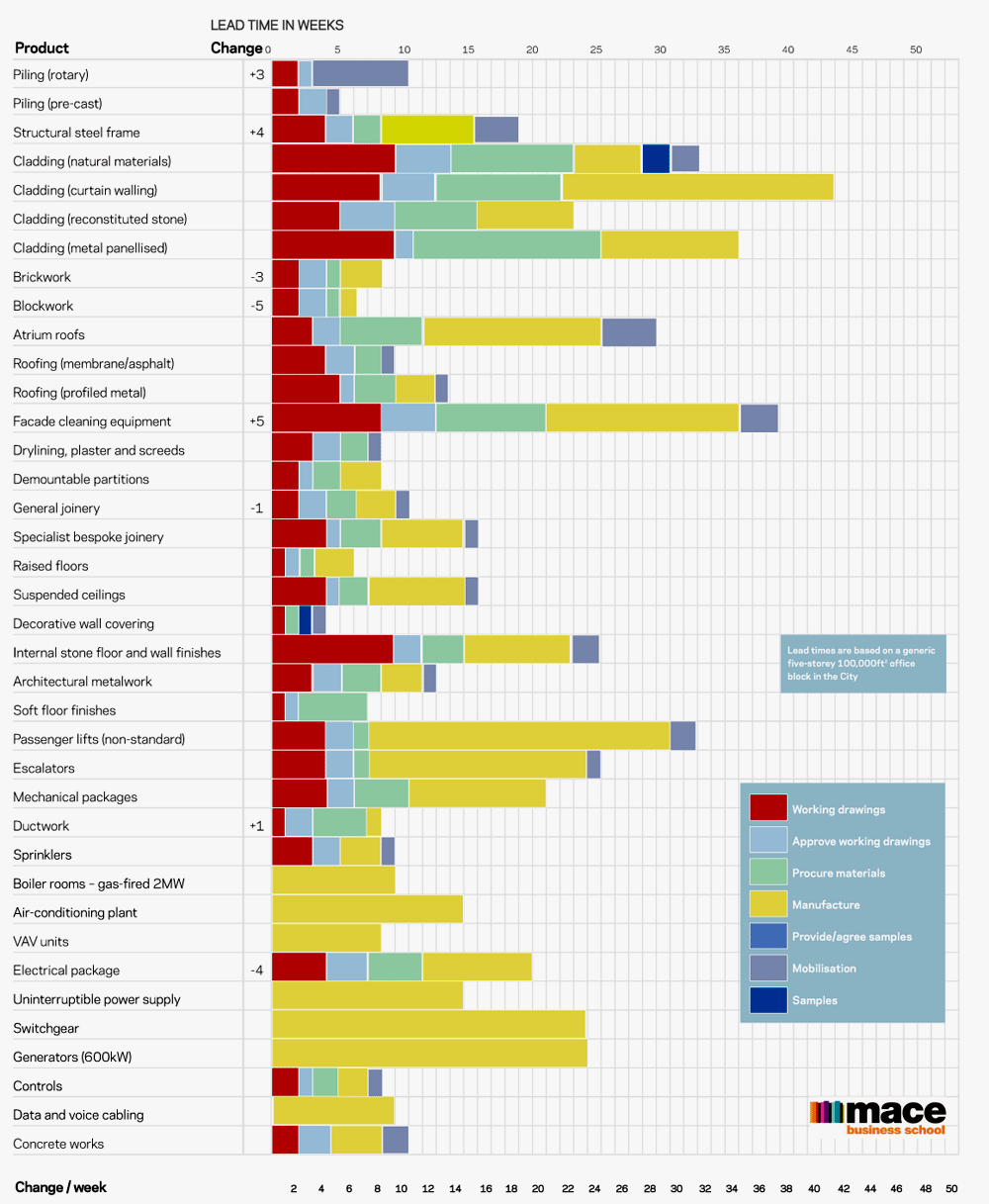 Boiler rooms and M&E plant and equipment currently stand at 14 weeks for air-conditioning, 16 weeks for uninterruptible power supplies, 23 weeks for switch gear and generators, and nine weeks for data and voice cabling and sprinklers . However, specialist larger equipment including biomass boilers, CHP plant and solar equipment were on longer lead in times, owing to higher demand for sustainable building.