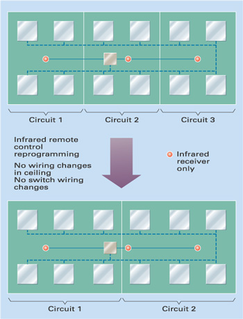 Luminaires can participate in more than one group if required, increasing the range of control options. This means that even a quite small room or area can have its own, highly flexible lighting, finely responsive for user's needs. Yet for all their sophistication, such systems are economic to install, easy to operate and extremely cost-effective.