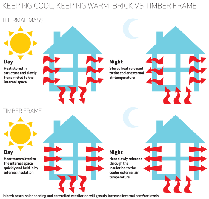 The two building methods absorb and dissipate the sun’s heat very differently. As the graphic at the end of the article shows, a building with high thermal mass behaves like a slow-motion storage heater, storing heat within the fabric for long periods during the day and releasing heat overnight, while a timber frame works like a thermos flask, absorbing heat more rapidly – and trapping it within the internal space.