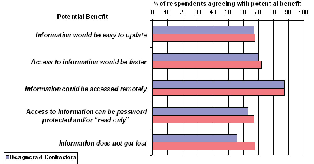 Clearly, remote access is seen as the greatest benefit with little difference in opinions between designers and contractors, and FMs and building owners, except when it comes to retaining information. Comments from a number of designers and contractors expressed the view that clients are concerned about the security of their information, but it seems that FMs are more concerned with ensuring that their building information does not get mislaid.