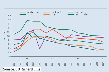 In London, the vacancy rate was at 33.5% in the second quarter of 2005. In Amsterdam, Frankfurt, Madrid and Paris the vacancy rate decreased to 42.5%, 48.3%, 50.2% and 33.3% respectively. (See graph).