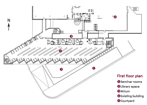 The upper floors are arranged with stacks at the centre and a variety of different study spaces at the perimeter, and reading areas arranged in timber and concrete-lined study bays run along the southern edge. The second floor reading hall is a 5 m high cathedral-like space slashed with angular north-lights.