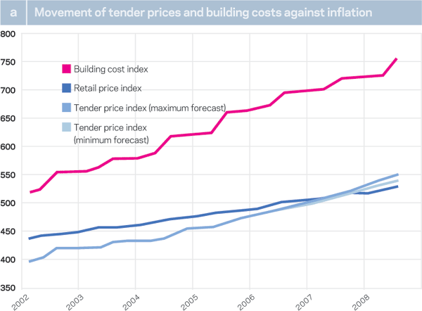 Major concrete packages have seen significant price rises – a result of price increases for concrete and reinforcement materials and of demand on the larger industry players. Curtain walling tenders have seen upward price revisions, partly because of increases in aluminium and glass prices but also as a result of the market consolidation reported in last quarter’s Market forecast (28 July).