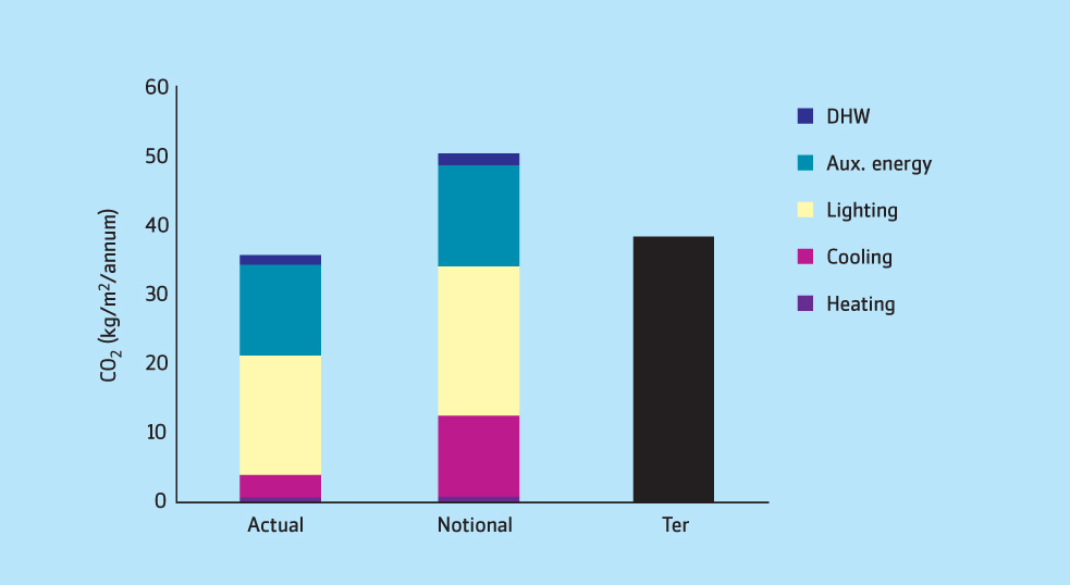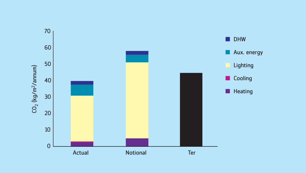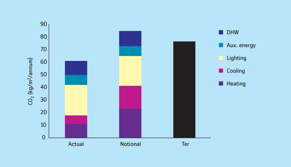 The actual building is then modelled using standard NCM data but including the energy-saving elements in the real building, such as heat recovery and lighting controls. The CO2 emissions from the actual building are termed the building emission rate. It is the building emission rate that, for example, has to be 28% less than the TER for an air-conditioned building to prove compliance with Part L 2006.