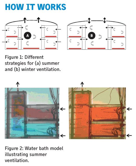 E-Stack tested this innovative design in an analogue water-bath model (Figure 2) to ensure the principles would work, and that the location and size of the clerestory openings atop the atrium would provide sufficient ventilation and mixing inside. The team also developed a dynamic thermal model to establish the ventilation rates necessary to achieve comfortable conditions and a satisfactory supply of fresh air, as well as determining heating required in the coldest weather conditions (external temperature <6C). In winter, the heating system is used early in the morning to pre-heat the space and is turned off as the occupant-generated heat load builds up.