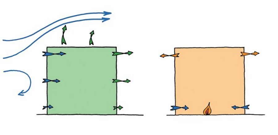 Buoyancy-driven ventilation is a bit more subtle than the wind. When air is heated its density reduces and it is displaced upwards by colder, denser air flowing in from the surroundings, leading to stratification of warm air over cold air.