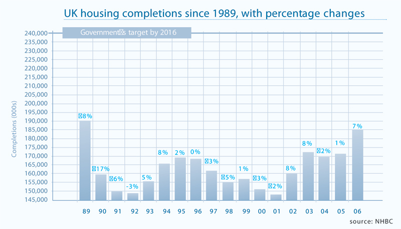 UK housing completions since 1989, with percentage changes