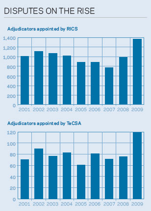 Meanwhile, adjudicator-nominating bodies the RICS and the Technology and Construction Solicitors Association (TeCSA) have both reported unprecedented rises in the number of disputes they handle (see graphs).
