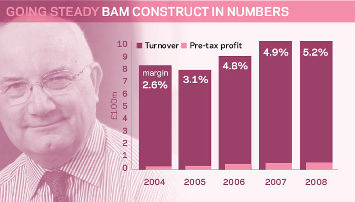 The company, which is the contracting arm of BAM Group UK, announced a 12% rise in turnover in the year to 31 December 2008 from £949m to £1.06bn. Pre-tax profit increased 7.6% from £48.7m to £52.4m, although that fell to £45.3m after property writedowns.