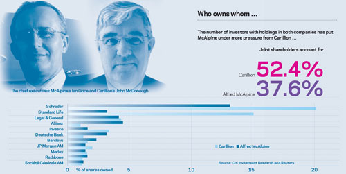 City institutions Standard Life, Schroders and New Star, which own for about 15% of McAlpine’s shares, have thrown their weight behind Carillion. Schroders and Standard Life are also shareholders in Carillion, which has added to the pressure on McAlpine, and reduced the likelihood of a hostile bid.