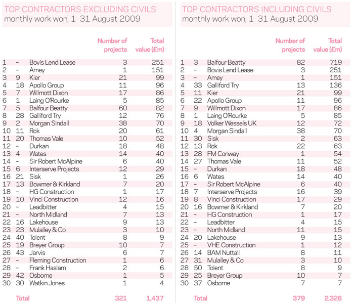 Even when civils work is added, Bovis and Amey still ranked as August’s second and third earners behind Balfour Beatty, which took the top slot after securing its largest monthly haul since January. But even its £718m total was boosted by its share of the £250m Stoke-on-Trent BSF scheme.