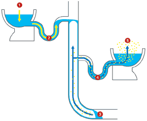 Jack warned something similar could occur if a surge in the flow in a sewerage system caused the pipes to become full and force air to move back up the system (see diagram).