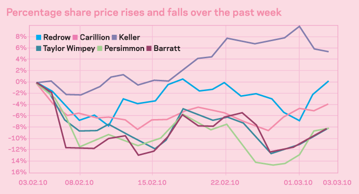 Taylor Wimpey reported a pre-tax loss of £640m for 2009, after taking a £604m writedown on land values in the first half of last year. It managed to make an operating profit of £43.3m on turnover of £2.6bn, down a quarter from last year, and to half debt from £1.53bn to £750m.