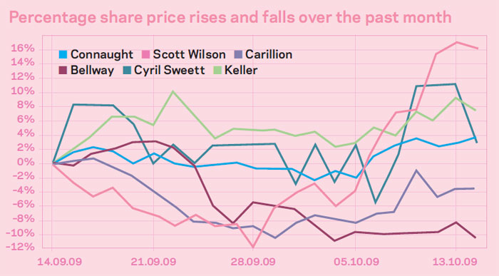 And the future of consulting engineer Scott Wilson was the subject of speculation after a Brewin Dolphin research note said it would be a prime takeover target for foreign players. As previously reported by Building, the management are understood to be deeply unimpressed by their stock market valuation and Dutch firms Arcadis and Grontmij are known to have had a look, despite the pension fund issues. Maybe they should hurry before things get too stable?