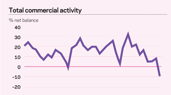 London recorded a drop in commercial activity for the first time since August 2003, although the pace of contraction, –2.1%, was less dramatic than the overall figure. Worst hit was the rest of the South-east, which dropped 10.2%, while the rest of the UK dropped 4.9%.
