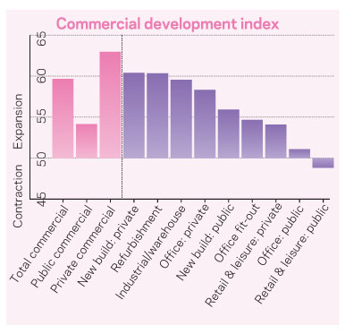 The private sector outperformed the public sector for the third month in a row, although the pace of expansion eased. This reflected the slower growth of work in private sector office, retail and leisure, and new-build projects.