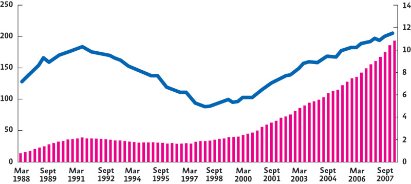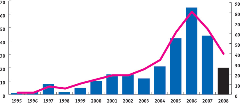 The City may bear the scars of the market’s worst excesses for years to come, but the whole property industry is set to suffer from a national unwillingness to finance new development. Lending to commercial property has prospered in line with the commercial mortgage-backed securities (CMBS) market – the financial ‘slicing and dicing’ of debt, which is sold off in smaller packages to multiple creditors (see graphs).