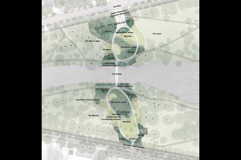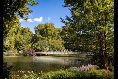 Foster + Partners’ proposal consists of a network of landscaped spaces either side of the park’s lake, linked by a new bridge which is set to replace the lake’s existing 1950s Blue Bridge. The design team also includes landscape designer Michel Desvigne.