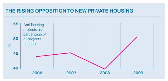 New private housing was the main target, accounting for 51% of all projects opposed, compared with 40% in 2008 (see graph). Meanwhile, the proportion of people who campaigned in favour of extra housing fell from 40% to 18%. Keable said: “I think development will become harder because there will be more on-the-ground opposition to residential.”