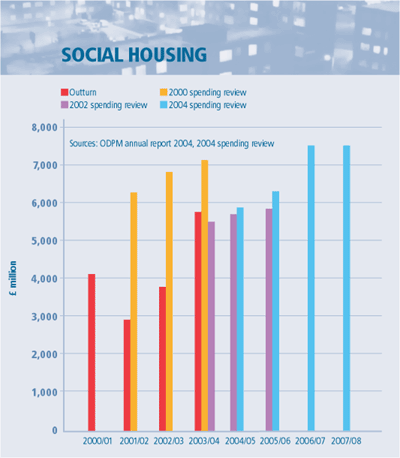 The aim to cut the backlog of council houses needing repair 900,000 by April 2004 was missed – the figure fell only 630,000.