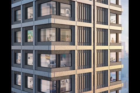 Other changes to the tower included lowering its height by three storeys, reducing floor-to-floor heights by 15cm per floor, introducing end-of-corridor windows on all floors and replacing all red-coloured elements with precast concrete.