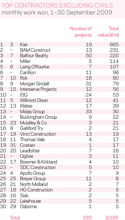The huge Kier win skews the figures slightly but the top 30 contractors won a total of £2bn in September, which compares with £1.4bn in the same month last year. Unsurprisingly, only £265m of last month’s haul came from the commercial sector.