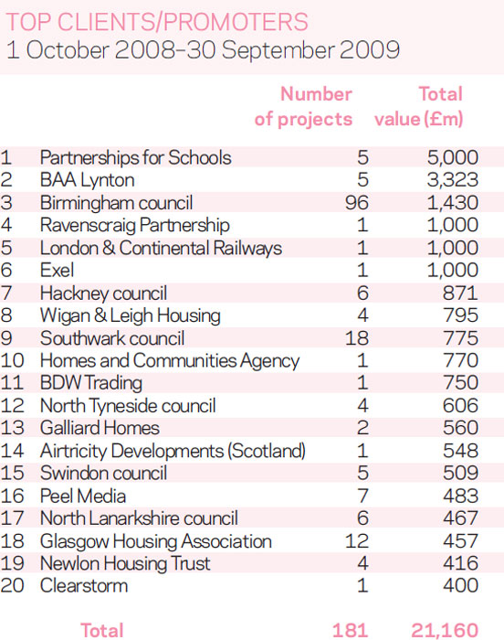 The top five was completed by Laing O’Rourke with seven deals worth £107.5m including a £25m deal for Northumberland Tyne & Wear NHS.