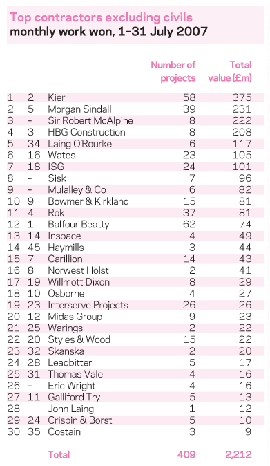In the annual top five Kier’s top place moved it up two places. Morrison is the only company that recorded a significant jump in the yearly ranking. It climbed 26 places into the top 30 after winning 15 civils projects worth £67m in July. In June, it secured just £5.5m of work.