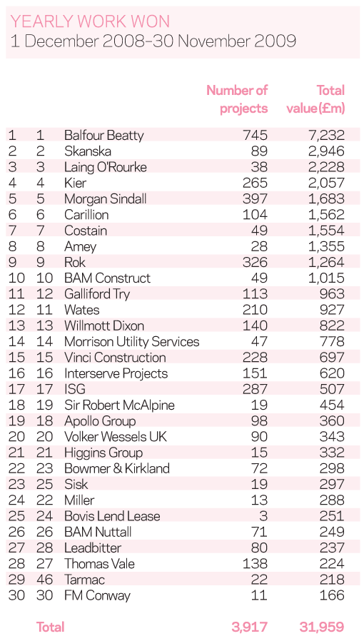 In November 2008, when Kier also topped the leader board, the average contract value for the top 30 was £4.3m. In November 2007, when Sir Robert McAlpine topped the table, the average contract value was £7m.