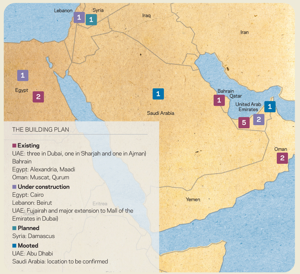 So it’s no surprise Emery is beaming with pride over his Café Nero coffee. But there’s not much time to relax. With Mirdiff more or less off his hands, Emery is focusing on the four MAF projects either on site or on the verge of being so: the 289m dirham (£52m), 26,557m2 extension to the Mall of the Emirates (pictured overleaf) and new centres in Cairo (featuring another snow park), Beirut and the UAE’s Fujairah.