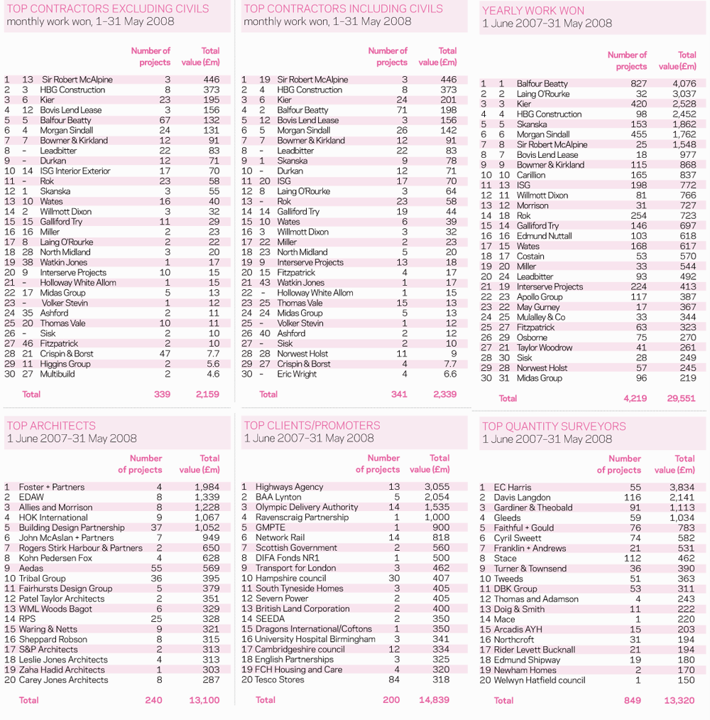 Kier finished in third spot with 23 contracts worth a total of £195.1m, which was up three places from April. Bovis Lend Lease jumped even higher, from 12th to 4th, with deals that included the £73m 11-storey New Court office scheme in the City of London.