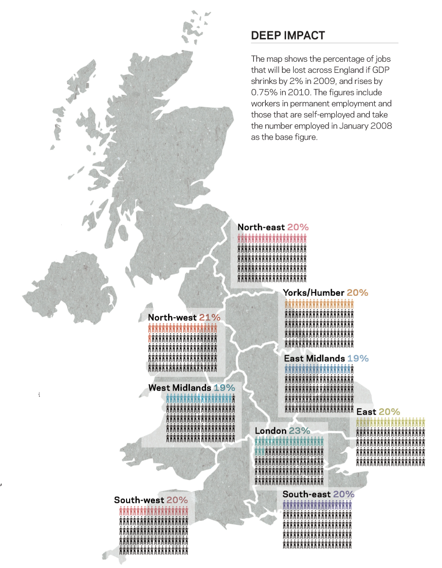 It is predicted that the area worst affected will be London, where 23% of the 215,800 workers are expected to be made redundant (see map).