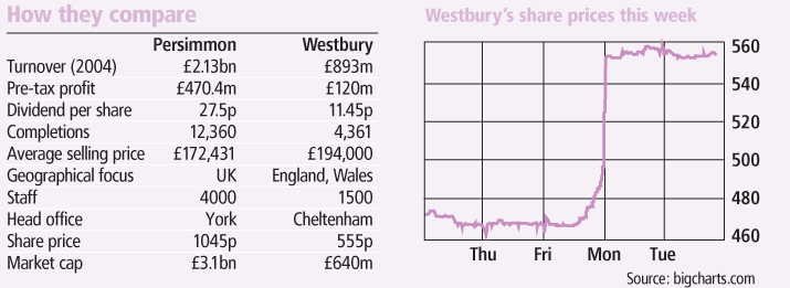Shares in Westbury, the smaller of the two companies, rose 6% to 494p on Friday when it announced just before close of play that it had received an approach. They jumped a further 13% to 556.5p on Monday when Persimmon emerged as the suitor.