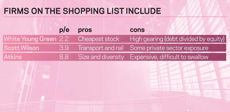 White Young Green was singled out by one source as the best deal. Following a profit warning in November, Arbuthnot put a p/e ratio of 2.2 on the company.