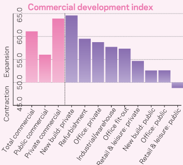 The latest growth follows a slight slowdown in April, when the index fell compared with March’s 66.2, which was the highest in three years. The expansion was fuelled by private sector development, which continued to rise at a faster rate than the public sector. Private new build was the best performing area, with the index rising to 64.7.