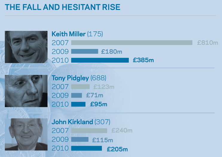 The industry’s biggest climber was Keith Miller, head of the contractor and housebuilder Miller Group, whose wealth rose to £385m (2009: £180m), making him the 175th richest person in the UK. The top construction boss was new entry Shwan Al-Mulla, who came 132nd with £500m.