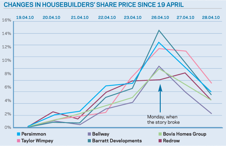 Shares in listed housebuilders jumped on Monday on speculation Horizon’s bid was the start of wider merger activity in the sector (see chart). However, analysts said it was most likely further bids for Crest would come from private equity firms that would be keen to take on its existing management.