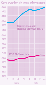 In the support services sector, shares in consultant White Young Green rose 5% to 295p, whereas John Laing dropped almost 5% to 254.75p. Atkins fell 2.3% to 670p after it revealed last week that it had set aside £3m to pay for missing its deadlines on station improvements on London Underground.