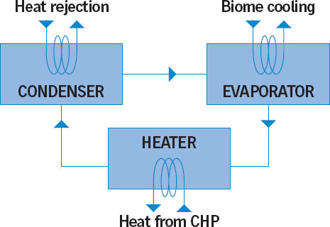 As with a conventional chiller, an absorption chiller has an evaporator and condenser. It is in the evaporator that the chiller removes heat from the biomes’ air supply. When the water evaporates it absorbs heat. This evaporated water is absorbed by the lithium bromide.
