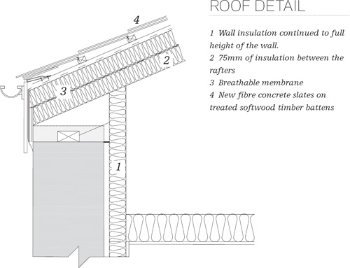 At roof level, 75mm of Kingspan Kooltherm insulation was placed between the rafters, followed by a breathable membrane, another 75mm of insulation and a second membrane. Here, the detailed work of taping and sealing the insulation is most evident. An air pressure test on the completed building returned a figure of 6.7m3/s/M2 at 50Pa.