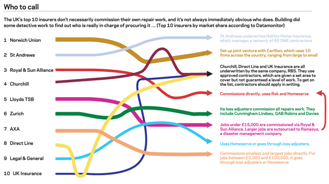 Britain’s largest insurer is Norwich Union, which also underwrites the Endsleigh and Saga brands. It commissions £170m of repair work a year on average, although that has nearly doubled this year because of the flooding. In November 2006, it set up a joint venture with contractor Carillion, called Asprea, which now handles all claims from start to finish. So far, 180,000 claims have been sent to Asprea, most for jobs worth less than £10,000.