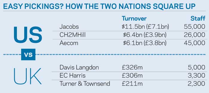 In addition to consulting engineers such as White Young Green and Scott Wilson, large QS and project management firms such as Davis Langdon, Cyril Sweett, EC Harris and Turner & Townsend are understood to be in the sights of the Americans.