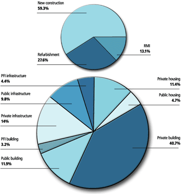 Fee income on new work has decreased and repair, maintenance and improvement work has increased by the same amount as a proportion of all work. Infrastructure projects have become more important: they account for 28% of all fee income, a rise of 8%. Healthcare and educational facilities have seen the largest growth in non-residential building projects. The amount of work procured through partnering agreements has increased from 9% to 17% since the last survey.