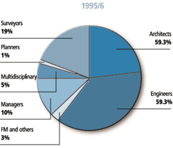This trend towards fewer, bigger firms may partly explain the fact that consultants are becoming more integrated into clients' supply chains. The survey finds that 17% of work is being procured through a partnering arrangement, compared with 9% in 1996. Multidisciplinary firms earn one-quarter of their fee income this way.