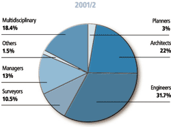 Guy Hazlehurst, a consultant with Davis Langdon Consultancy, points to the rise of multidisciplinary firms as one of the report's most significant findings – these outfits account for 18% of total fee income, compared with 5% in 1996. "Less is being done by professionals dedicated to one area. For example, multidisciplinary firms now do more surveying than dedicated surveying firms," he says.