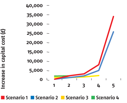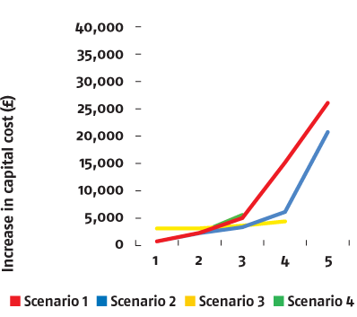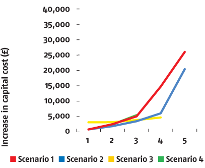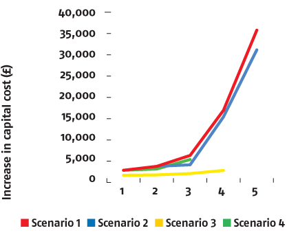 The estimated costs of achieving level three requirements for energy vary considerably depending on the scenario used (see table 4). While scenario two (using small-scale wind turbines) has the lowest overall costs for the houses, this is perhaps the least widely applicable, as it relies on the presence of at least medium wind speeds – sufficient for 1,100kWh per year from a 1.5kW turbine. The very low compliance costs identified for the two Design for Manufacture homes are a result of the high levels of insulation included in their panelised structure, and in the case of the SixtyK House, the use of an energy services company (Esco) to provide site-wide CHP and renewable energies. Although substantial, the infrastructure provided by the Esco is not factored in to the cost analysis because the cost is not incurred by the developer. Instead,