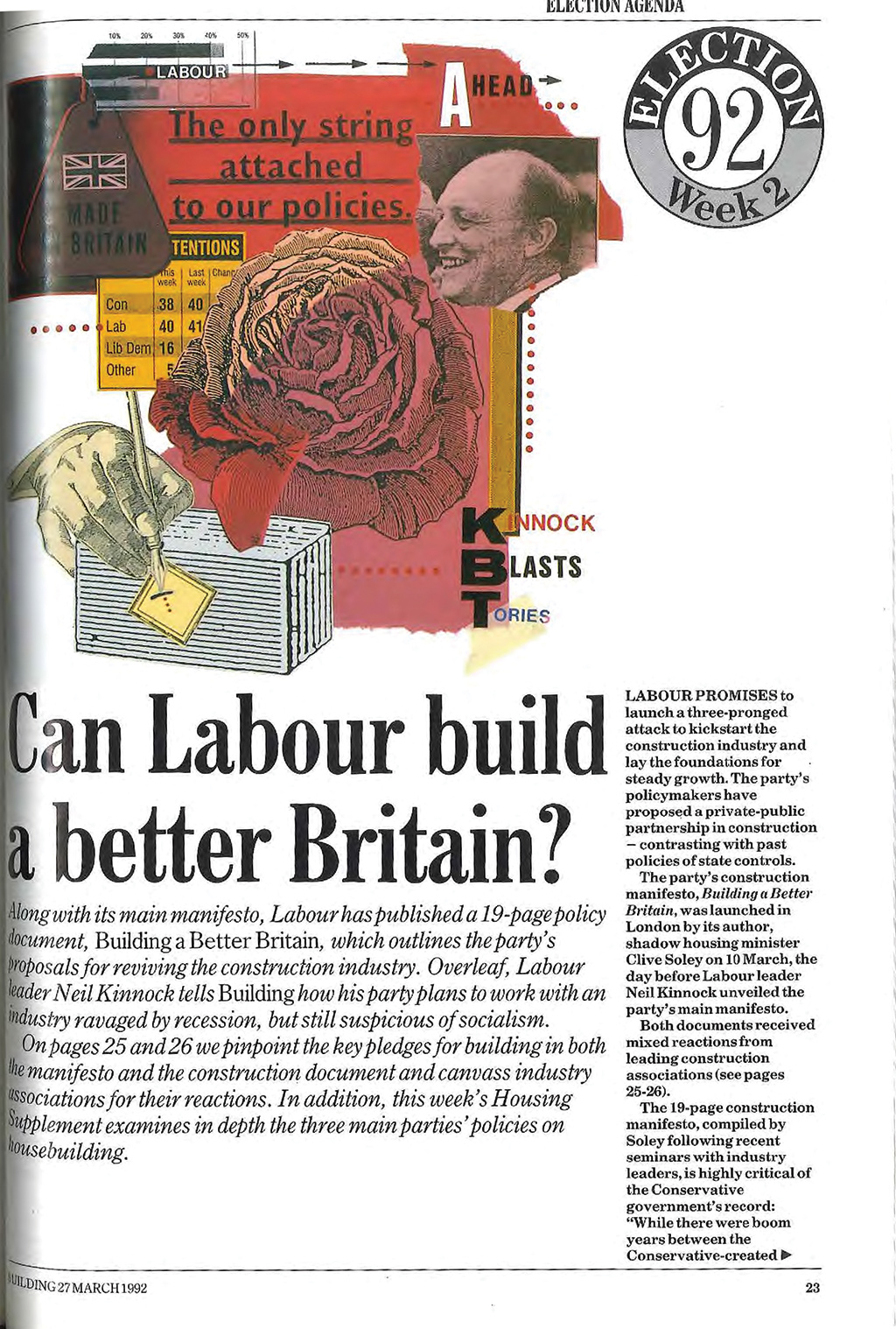 It may have escaped your notice, but in a few weeks’ time Britain will be heading to the polls to decide on whether the country should be governed under a shade of blue, red, yellow, purple, green or some murky blend. As each party begins to draw its battle lines on construction, we take a look back to the 1992 election, when Labour leader Neil Kinnock spoke directly to Building, following the publication of his party’s Building a Better Britain construction manifesto. The manifesto aspired to repair an industry that had been bruised by recession, and which was dealing with the problems of skill shortages and underfunded training.