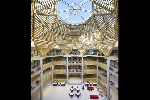 Its vast atrium rises through several floors beneath a glass and steel dome. Steve Holland, contractor Laing O’Rourke’s project director, recalls that “each dome was preassembled adjacent to the building and then craned into place as a single piece. The accuracy had to be millimetre-perfect.”