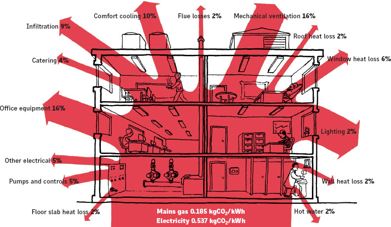 To effectively conserve energy in buildings it is first necessary to understand where it is used. Figure 1 (below) indicates the carbon dioxide emissions from a typical new-build office under the 2006 Building Regulations Part L. About 75% of the total CO2 emissions are regulated: that is they are associated with the fixed building services and measured under the Building Regulations, BREEAM and other assessments. This is the part of the building performance that we can influence in the design. The remaining 25% of emissions relate to the occupancy and business functions of the building and arise mainly from the use of IT and office equipment.
