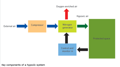 Hypoxic systems differ in one basic respect: they are designed to prevent a fire from occurring by maintaining a low oxygen or hypoxic environment within the protected space. This is created by altering the ratio of oxygen and nitrogen.